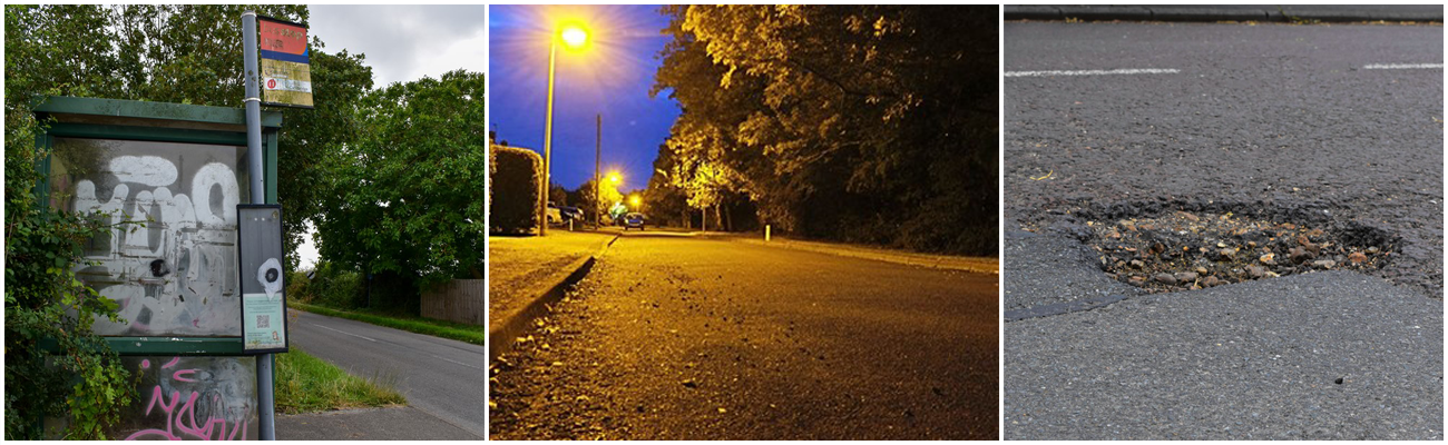 To report pot holes or other problems with roads and pavements or streetlights to Cambridgeshire County Council please use these links: